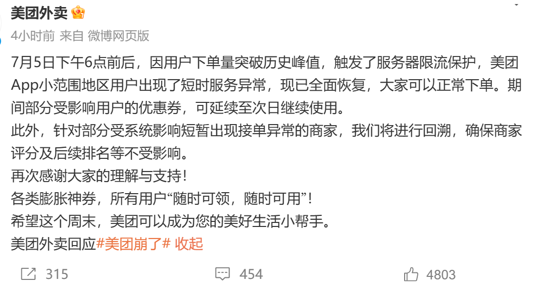 随着优惠券的发放,不断有用户涌入阿里、美团两大平台下单,导致美团一度出现宕机。网友反映美团外卖点餐页面卡顿、优惠券使用异常,多次重试仍无法下单。对此,美团方面回应称,7月5日下午6点前后,因用户下单量突破历史峰值,触发了服务器限流保护,美团App小范围地区用户出现了短时服务异常,现已全面恢复,大家可以正常下单。在此期间部分受影响用户的优惠券,可延续至次日继续使用。此外,针对部分受系统影响短暂出现接单异常的商家,“我们将进行回溯,确保商家评分及后续排名等不受影响”。
