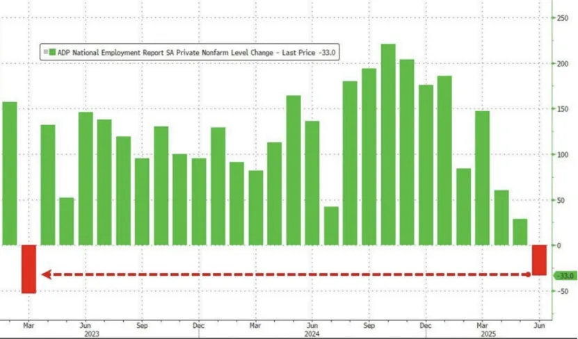 7月2日晚间,ADP Research公布的数据显示,美国6月ADP就业人数(即“小非农”)减少3.3万人,预期为增加9.8万人,创下自2023年3月以来的首次负增长,5月份的数据也由增加3.7万人修正为增加2.9万人。