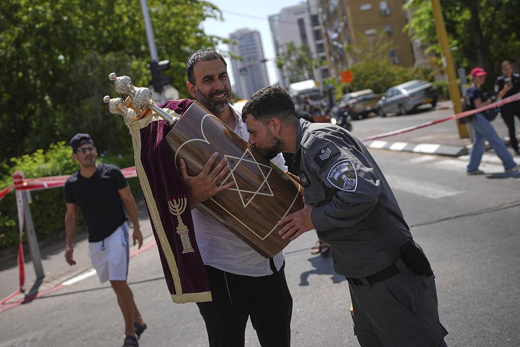 当地时间2025年6月19日,以色列特拉维夫附近霍隆,一枚伊朗发射的导弹击中一座犹太教堂,一名以色列安全部队成员亲吻从受损犹太教堂中取出的《妥拉》卷轴 视觉中国 图