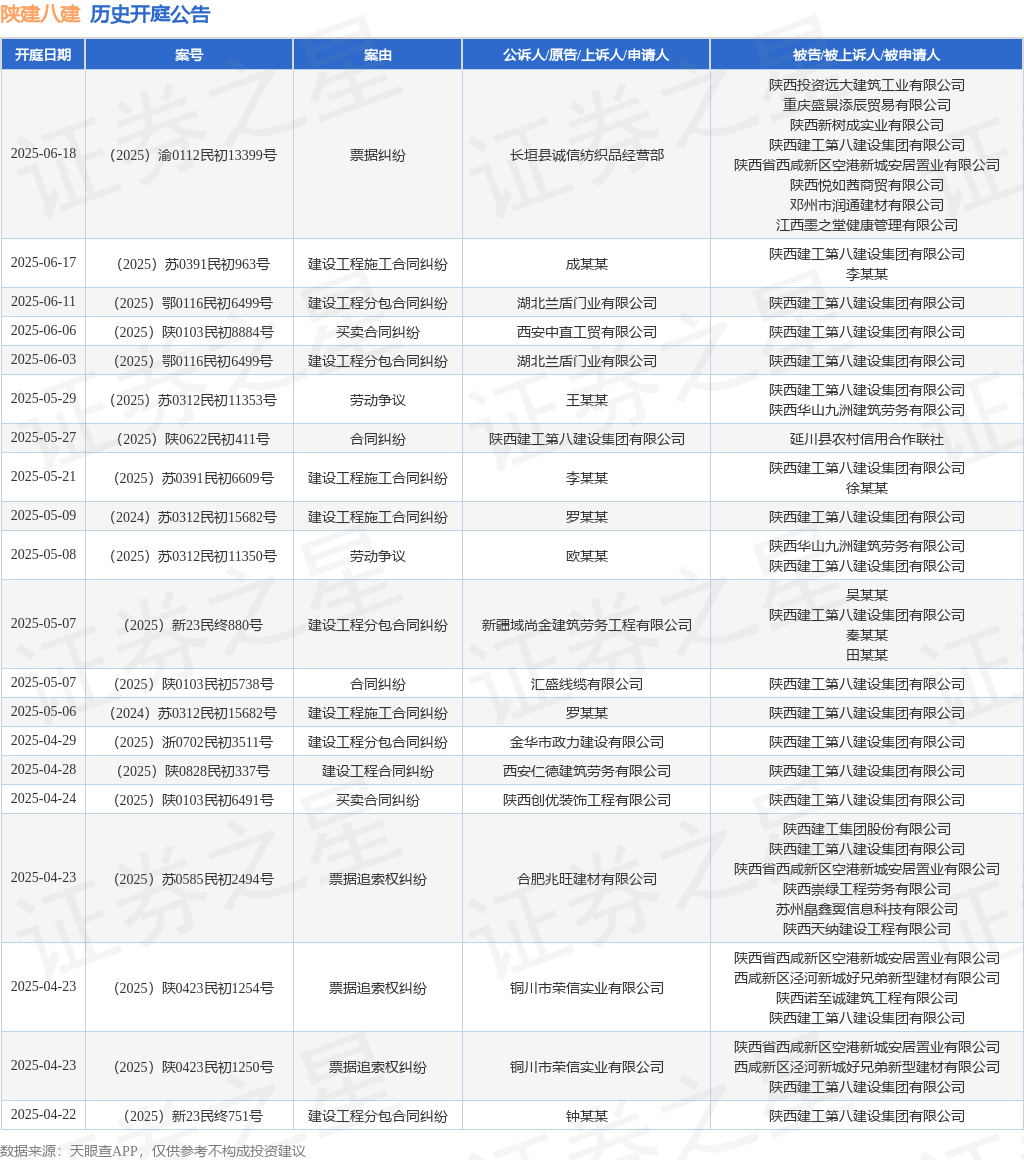 案号:(2025)渝0112民初13399号审理法院:重庆市渝北区人民法院案由:票据纠纷当事人信息: 原告/上诉人:长垣县诚信纺织品经营部 被告/被上诉人:陕西投资远大建筑工业有限公司、重庆盛景添辰贸易有限公司、陕西新树成实业有限公司、陕西建工第八建设集团有限公司、陕西省西咸新区空港新城安居置业有限公司、陕西悦如茜商贸有限公司、邓州市润通建材有限公司、江西墨之堂健康管理有限公司开庭日期:2025年6月18日根据统计,近一年内以陕西建工第八建设集团有限公司为当事人的历史开庭公告有203则,其中案由为“买卖合同纠纷”的公告以37则居首,其次为“票据追索权纠纷”有28则,“合同纠纷”有27则。历史开庭公告(前20条)如下: