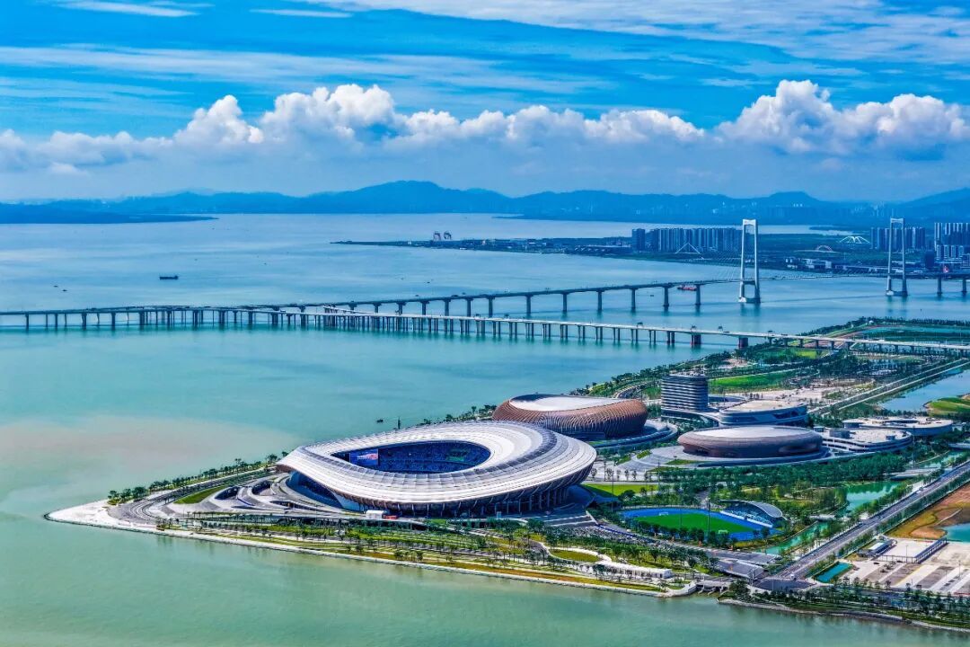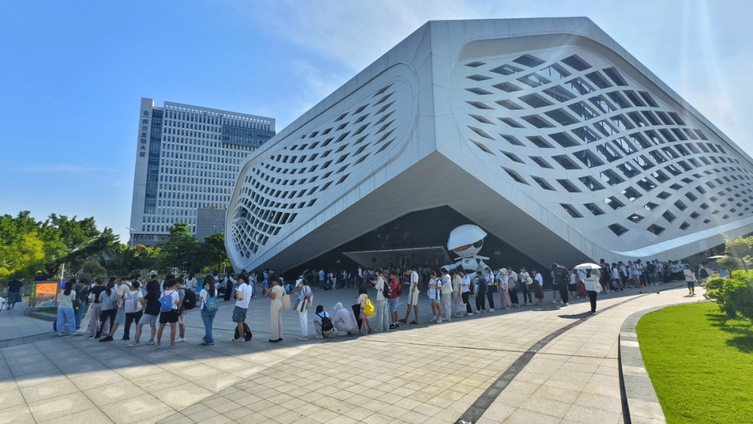 3座线条流畅的巨型建筑、150米“海景之窗”可远眺海天一色与深中通道、上万个蓝色座椅连成“海洋”等特点,让场馆成了大湾区新晋打卡点,出片效果拉满!